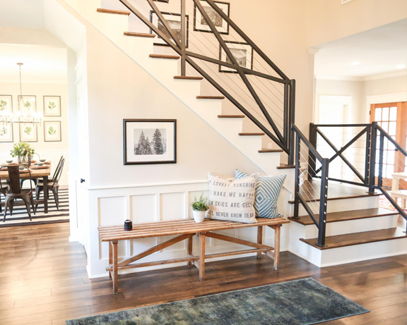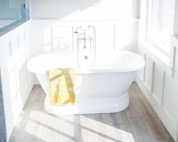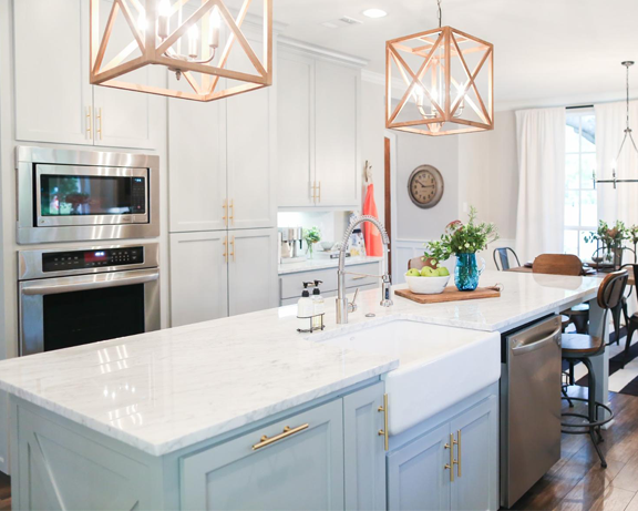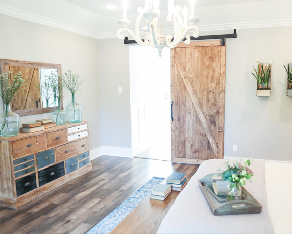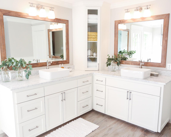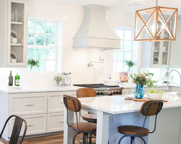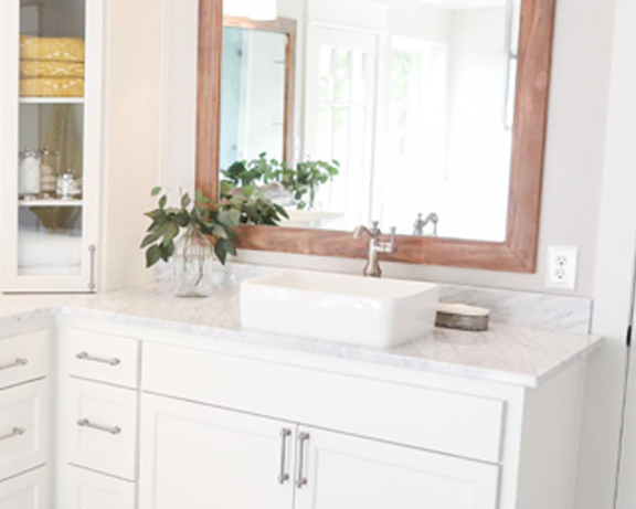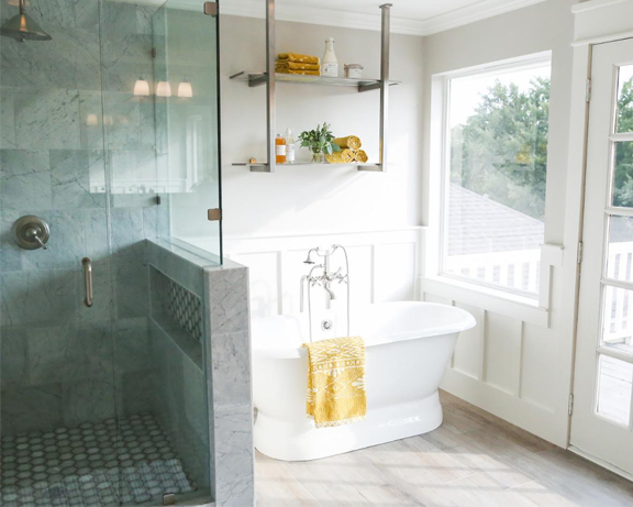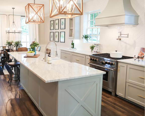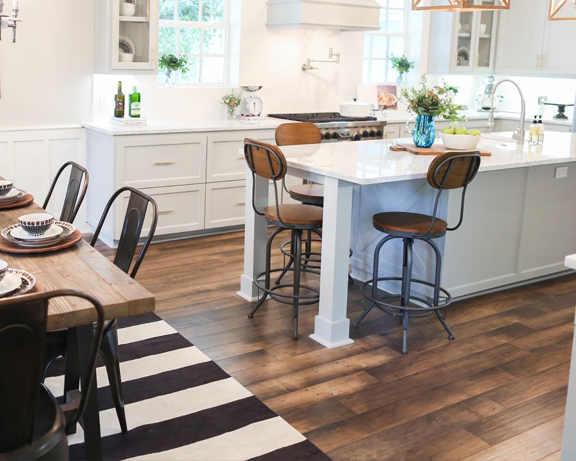 This adventurous couple did not mind stepping out of their comfort zone when choosing this 90’s house. They were concerned about the dated interior and if they could find a more casual and practical style. DesignCo updated this dated look with Biance Venetian marble countertops, Ansley Park Eiffel maple laminate flooring, Quinland Blend mosaic, and Woodland 8×48 tiles. These pieces really brought the modern-traditional style Chip and Joanna needed to match their clients needs.