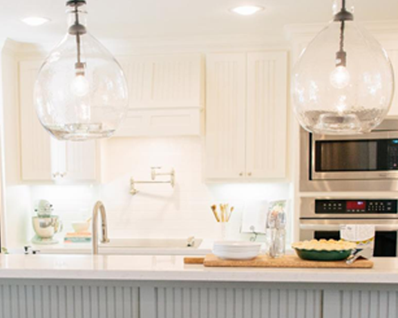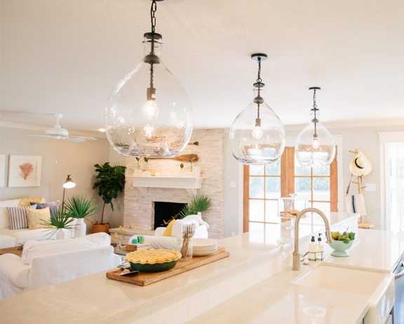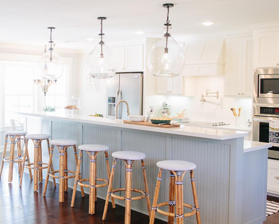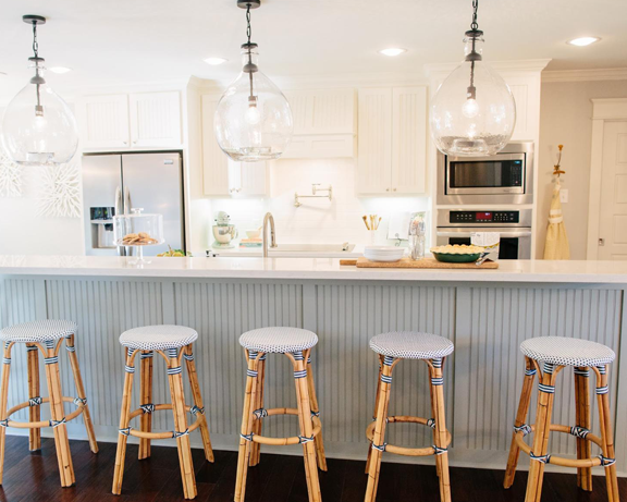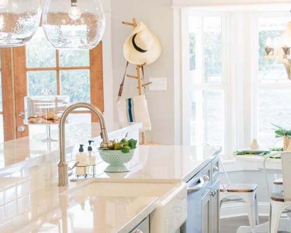 A coastal makeover was the theme for this 1971 ranch house. Chip and Joanna completely transformed the dated plain 70’s ranch house into an updated, relaxing beach themed home. Primary colors used were a calming blue-gray with crisp DesignCo Cararra marble countertops to contribute to the overall relaxed, coastal theme. This main area of the house was a primary setting to tie in with the other rooms of the home.