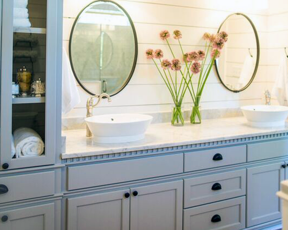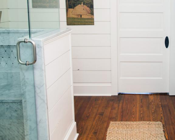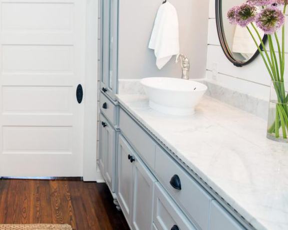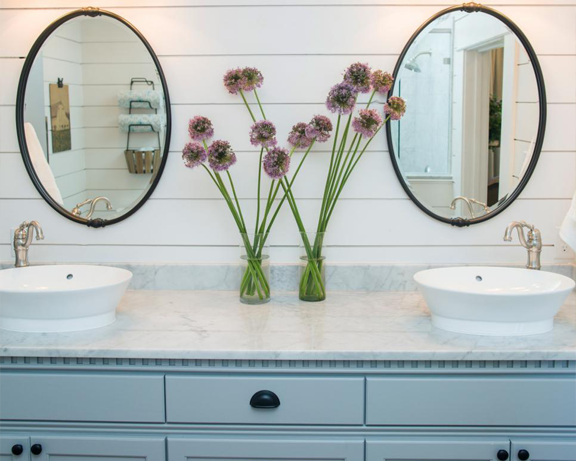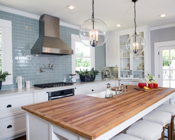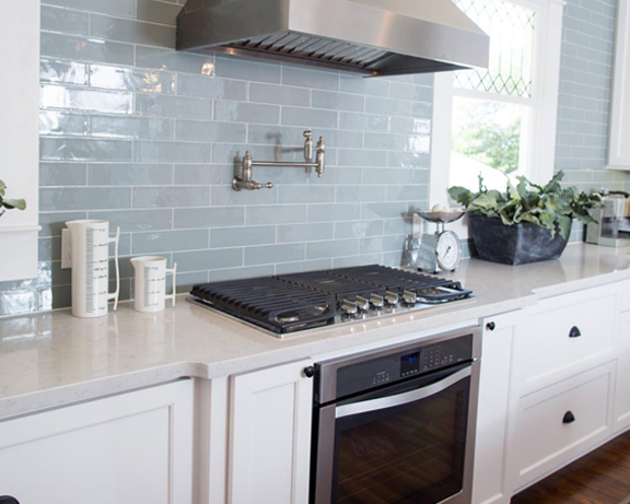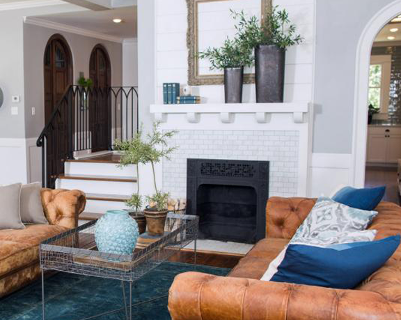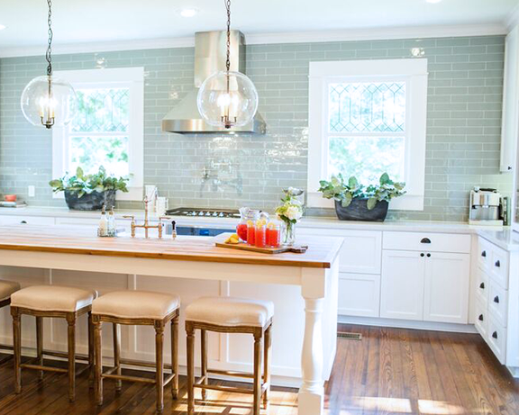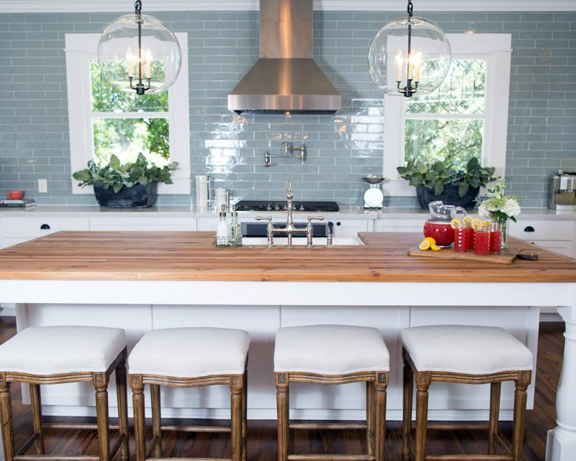 The first episode of season 3 on HGTV’s Fixer Upper showed this spacious 20thcentury home that had been vacant for two years. After being badly neglected, Chip and Joanna Gaines were able to turn this 3500 square feet house from a run-down property into a visually striking home. The countertops consisted of Lagoon Quartz with a muted blue subway tile for the backsplash, requested by homeowner. Old Chicago Bricks were used for a pillar to continue the stylish theme up stairs. In the bathroom, Octagon tiles were used as accent pieces in the shower to add a visually sleek tone. All of these products used for this stylish and inviting home can be found at DesignCo.