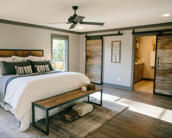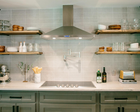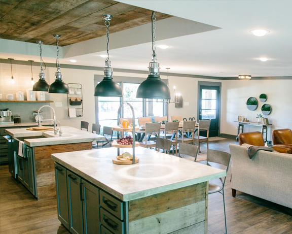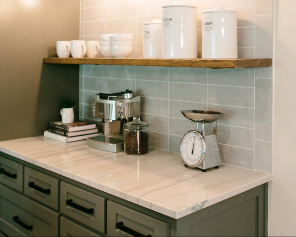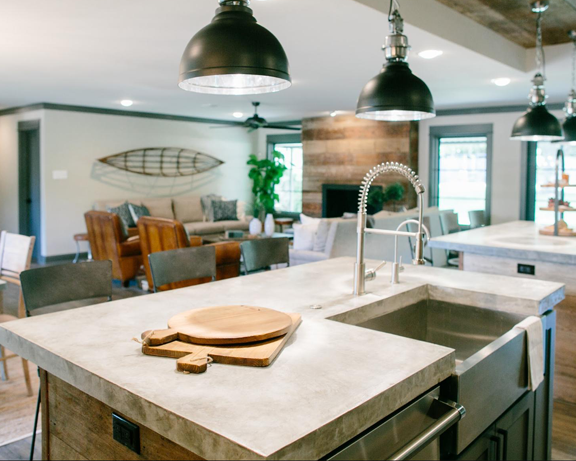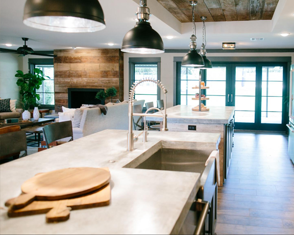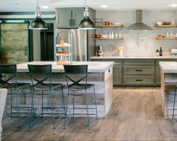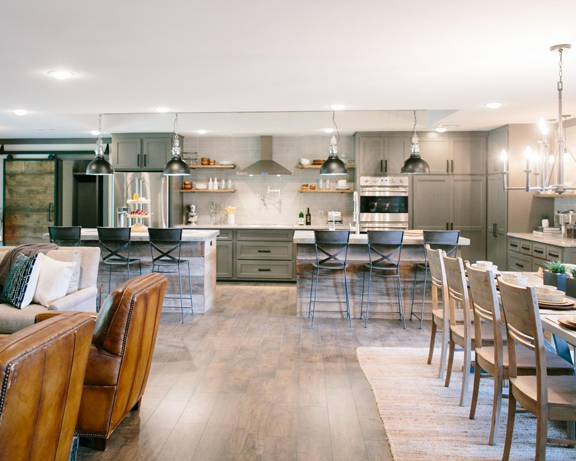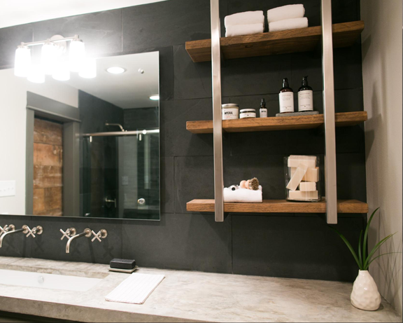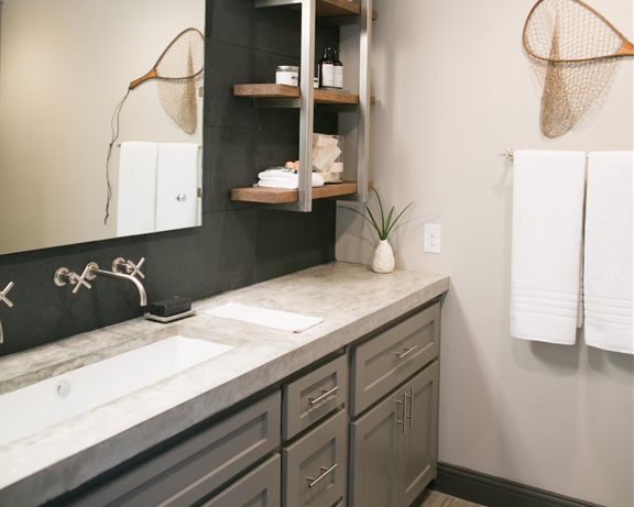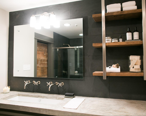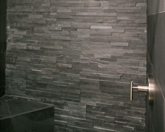 One of the main challenges for this house was fitting a bachelor pad style. The client is Involved in several sports so the design had to have a masculine edge to the home. Quite a few walls in the living room, dining, and kitchen area were removed to create an open space that highlighted the flooring leading into the kitchen. DesignCo installed Restoration Collection, color acorn, laminate flooring in all main rooms of the house. In the kitchen, Pistoria cemere tile 24×24 was used for a backsplash witch Bianca Venetian countertops. In the bathroom, the showers stonewall consisted of Shadowstone Charcoal stones with Montauk black 12×24 tiles. These rich colors brought out an earthy tone and matched the masculine look to fit the clients personality.